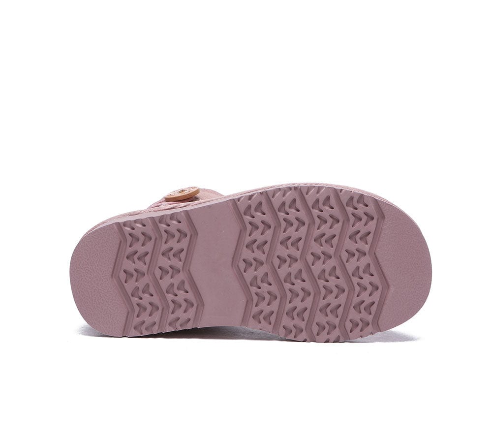 Crafted from 100% genuine sheepskin wool, the Nolan Kids Mini Button features a soft plush lining and a snug fit, providing insulation without compromising on breathability. The sturdy rubber sole ensures traction and durability while the classic button closure makes getting ready a breeze.